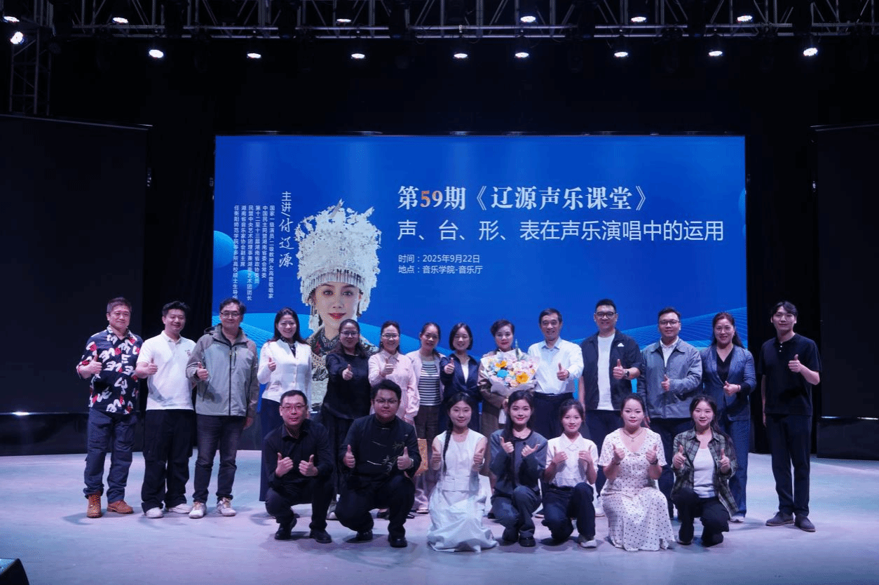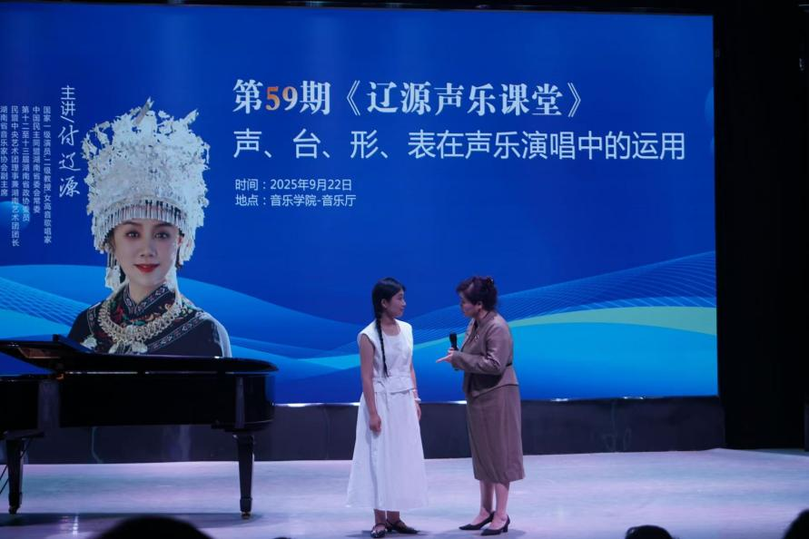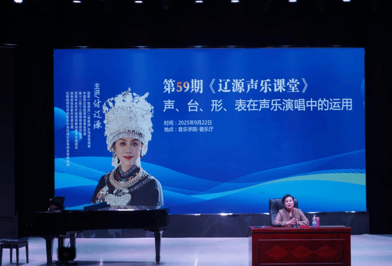 为进一步提升我院音乐专业硕士人才培养成效,2025年9月22日下午,国家一级演员、二级教授,湖南省文化馆女高音歌唱家,我院客座教授、音乐专业硕士研究生的行业导师付辽源教授,应邀到我院演艺厅开展主题为“声、台、形、表在声乐演唱中的运用”的学术讲座与实践教学。本次学术活动由院长段桥生教授主持,学院全体音乐专业硕士研究生和部分教师与本科生共400余人到场聆听。