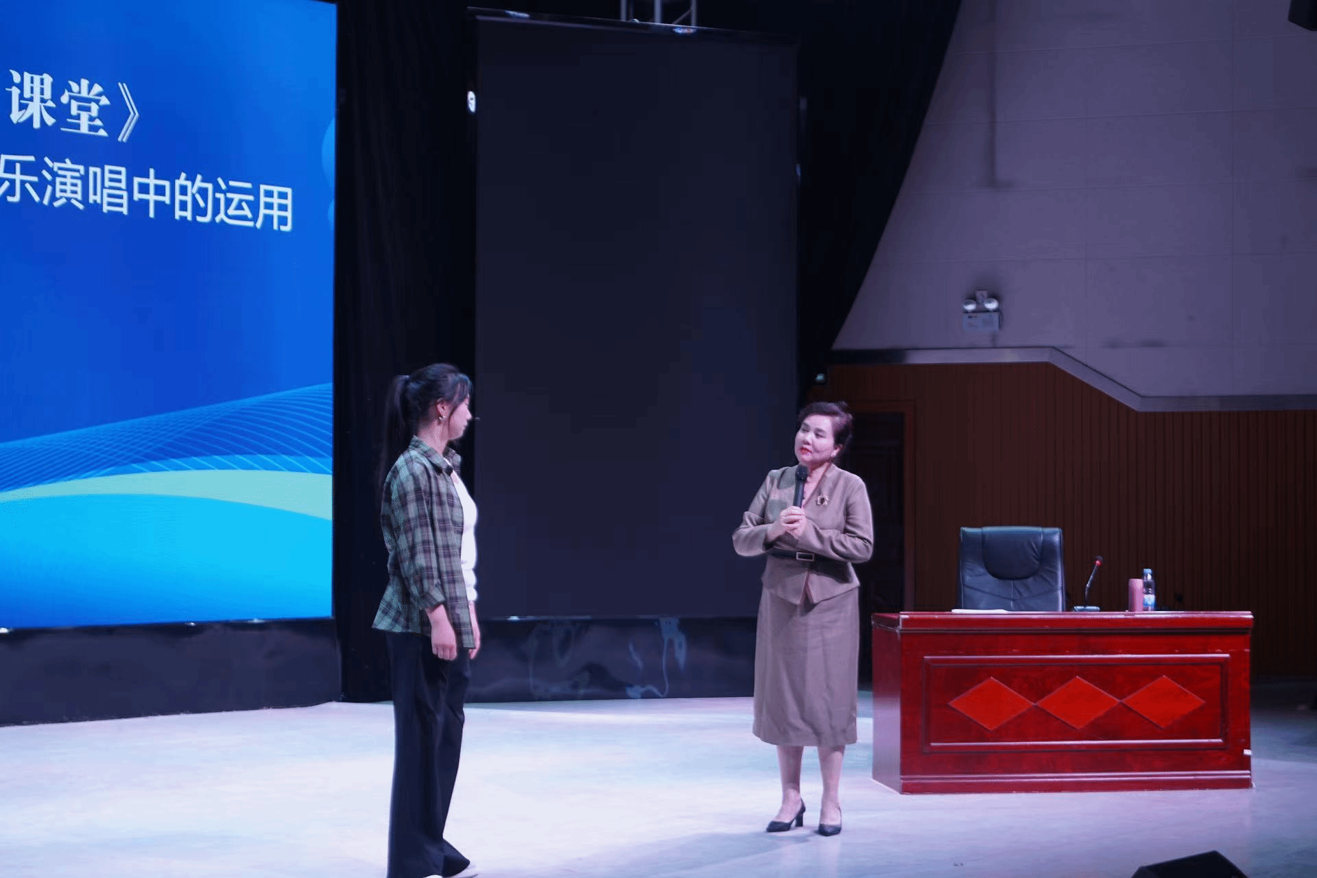 在实践教学互动环节,音乐学院多位研究生先后上台进行现场演唱,付教授针对每位同学的演唱姿势、呼吸控制、咬字吐字、情感表达及舞台表演等问题逐一进行耐心、精准的指导,现场气氛活跃、精彩不断、掌声不断,全场观众尤其是受教学生更是收获满满!